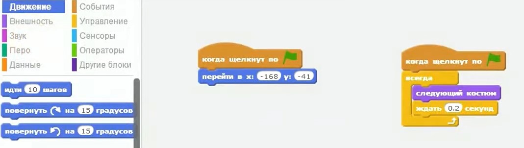 Первоначально, необходимо привязать персонажа к одному месту. Для этого необходимо написать программу, параллельную написанной ранее. «События» и «когда щелкнут по (изображение зеленого флага)«, «Движение» и «перейти в х: … у: …». Координаты, указанные в окошках при кнопке «перейти в х: … у: …» — местоположение персонажа в данный момент.
