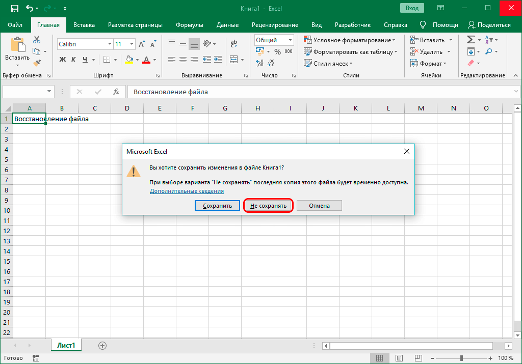 В случаях, когда причиной несохранения данных является не программный сбой или проблемы с электросетью, а случайная ошибка пользователя, который просто не сохранил книгу перед ее закрытием, восстановить данные можно следующим образом.