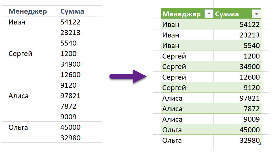 Если ваши данные организованы в таблице Excel (что можно легко сделать, нажав сочетание клавиш Ctrl+T