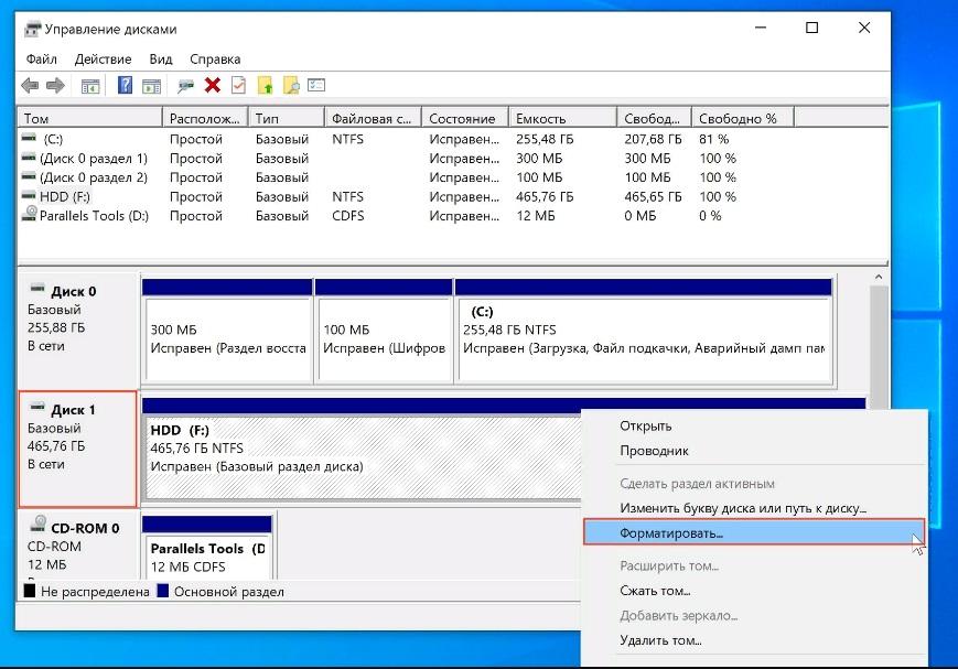 В меню «Управление дисками» найдите нужный раздел, кликните ПКМ и выберите «Форматировать».