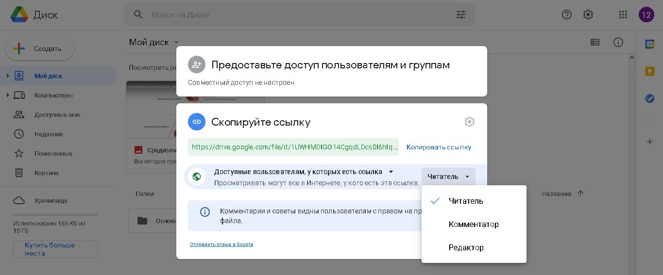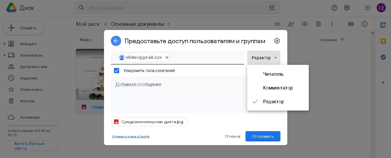 В диалоговом окне «Поделиться с людьми и группами» добавьте имя соавторов. Установите уровень разрешений ваших соавторов из раскрывающегося списка рядом с полем имени. Google Drive имеет следующие права доступа: Редактор, Просмотр, Комментатор.