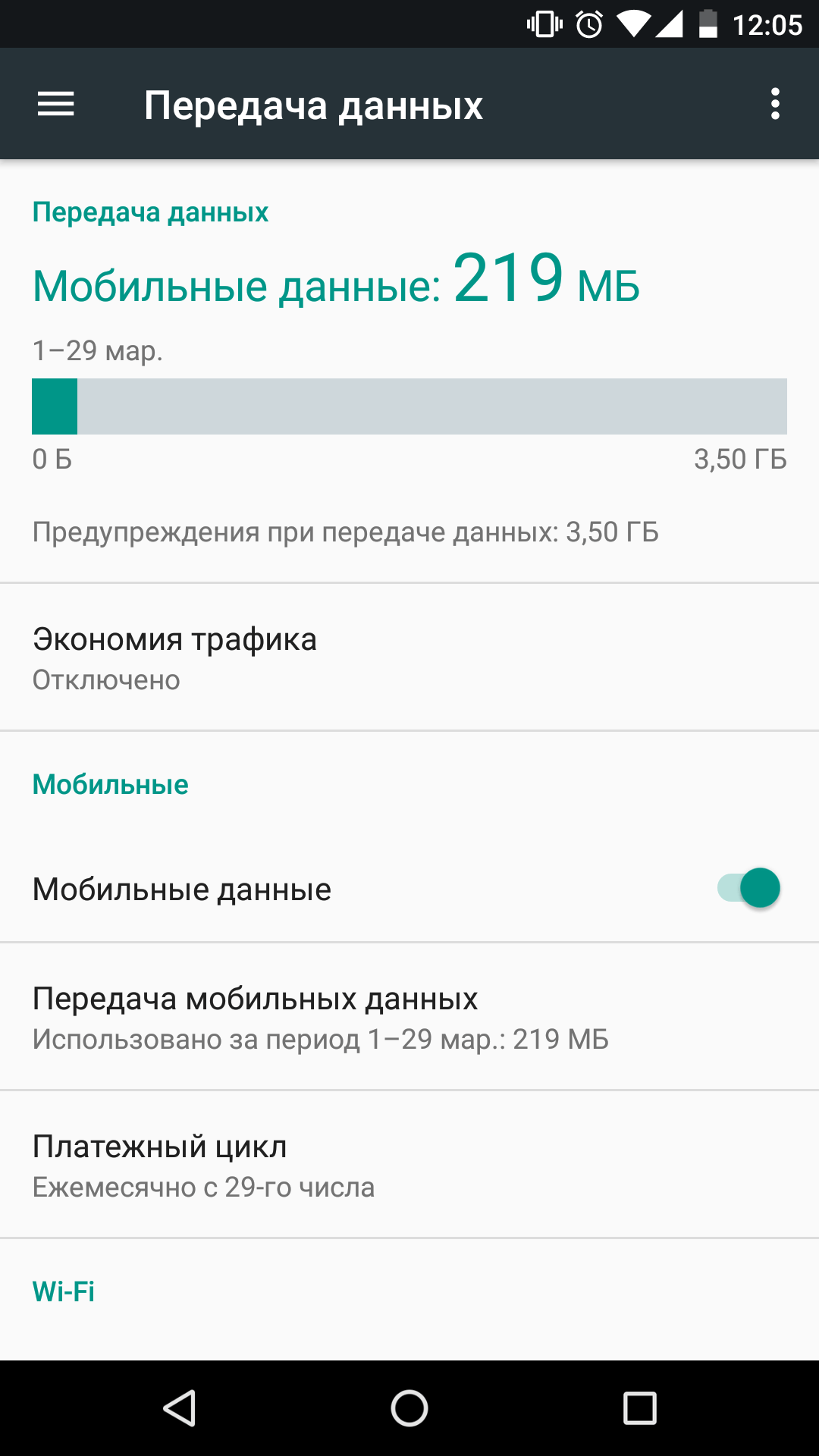 Здесь же в настройках использования данных можно установить периодичность оплаты (по тарифному плану оператора) для удобства формирования статистика использования мобильного трафика. Обычно это 1 число каждого месяца.