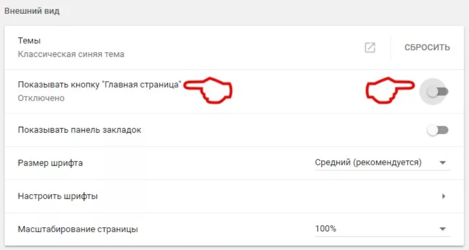 - в открывшемся разделе выбрать секцию «Внешний вид», отметить в ней маркером строку «Показывать кнопку «главная страница» и прописать адрес www.google.ru;