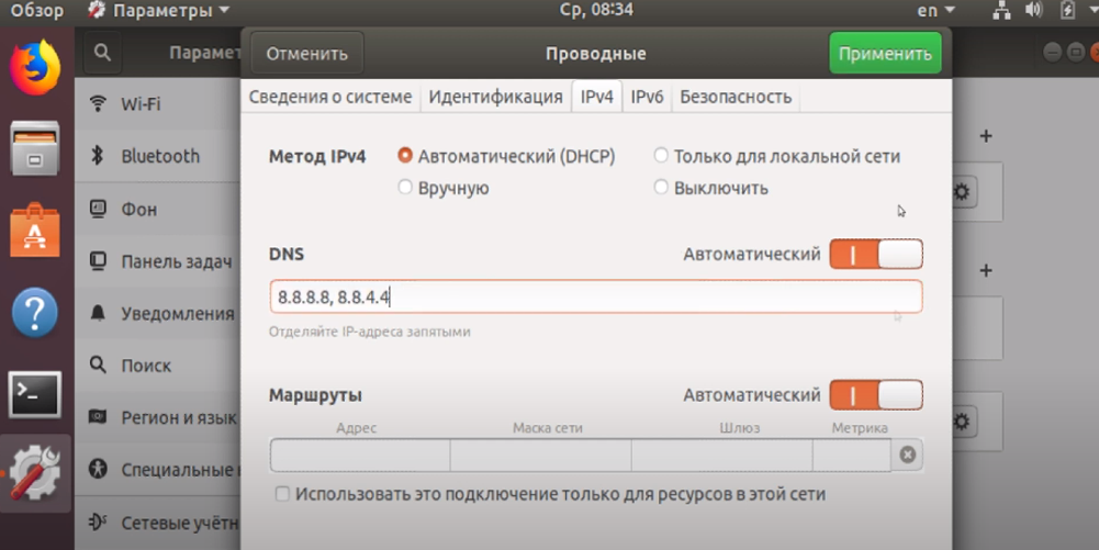 В Настройках сети переходите во вкладку “IPv4”. Далее выбирайте автоматический метод и в поле DNS прописывайте адрес сервера. Адреса быстрых DNS-серверов вы можете найти в нашем блоге в статье Рекомендуемые публичные DNS сервера. Несколько адресов прописываются через запятую.