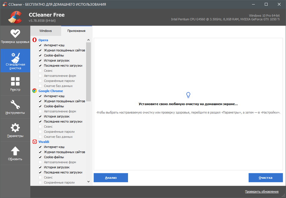 Посмотрим, как это сделать в бесплатной программе CCleaner: