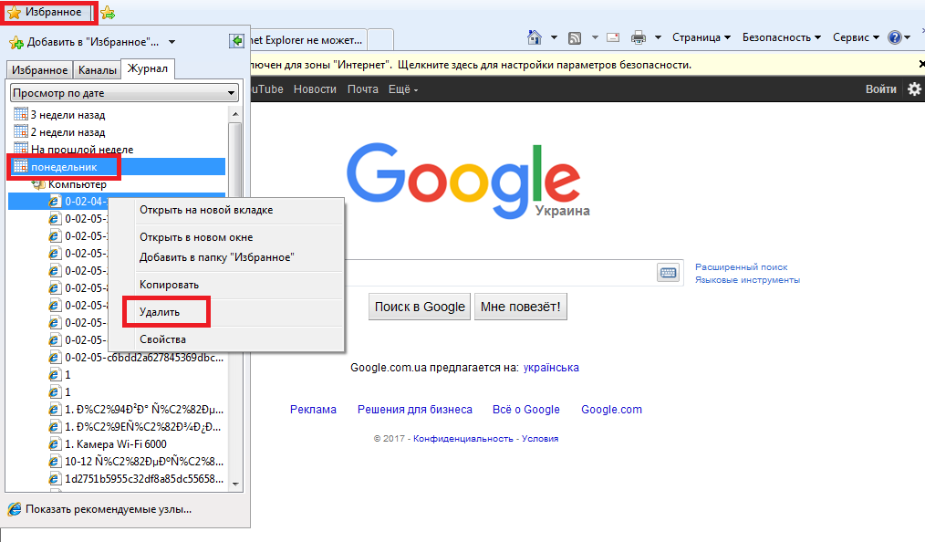 Для этого следует просто открыть журнал (кнопка «Избранное» на панели), найти адрес веб-страницы и удалить его вручную. Или сделать то же самое для целого дня.