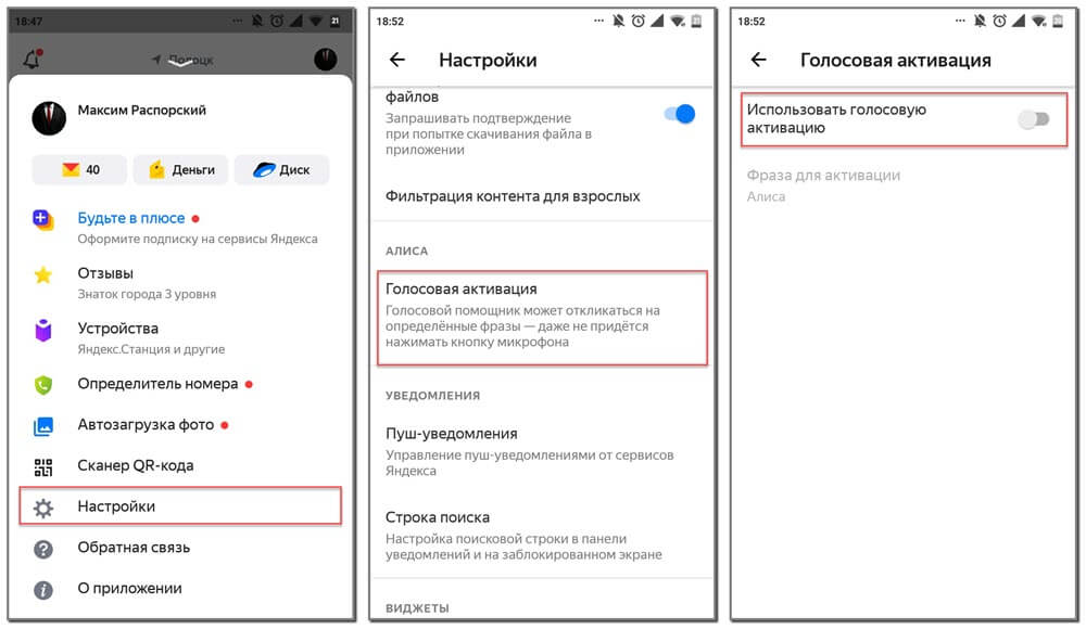 Обратите внимание: если вас раздражает спонтанная активация голосового помощника, или вы столкнулись с проблемой большого расхода оперативной памяти, то в этом случае можно просто отключить непосредственно функцию голосовой активации, не отключая при этом Алису