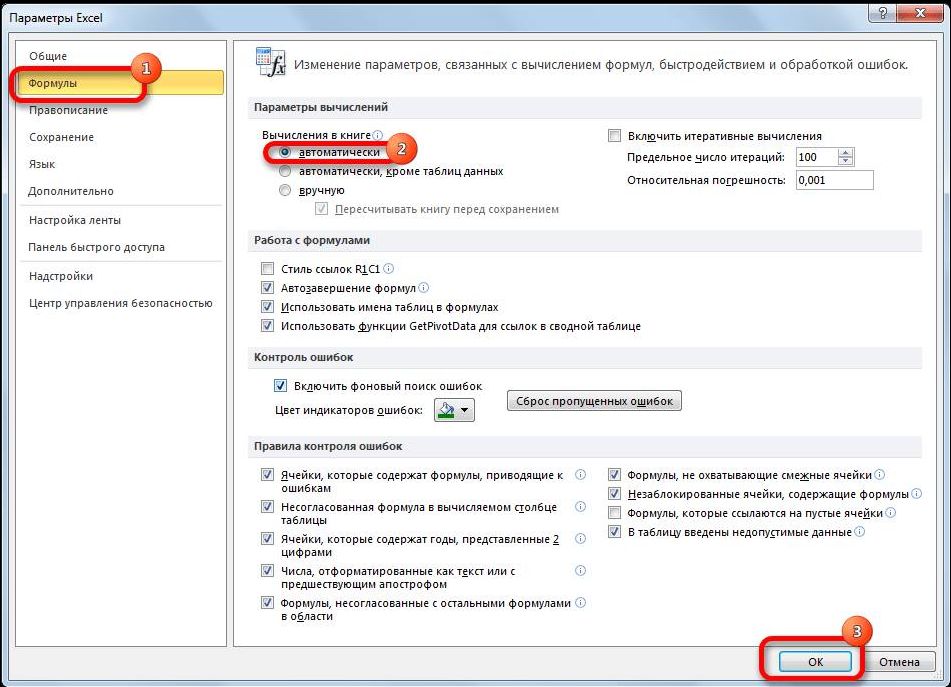 В открытом окне необходимо перейти во вкладку «Формулы». Здесь находятся параметры вычислений. Достаточно установить флажок на пункте «Автоматически» и сохранить изменения, чтобы система начала проводить перерасчет.![]()