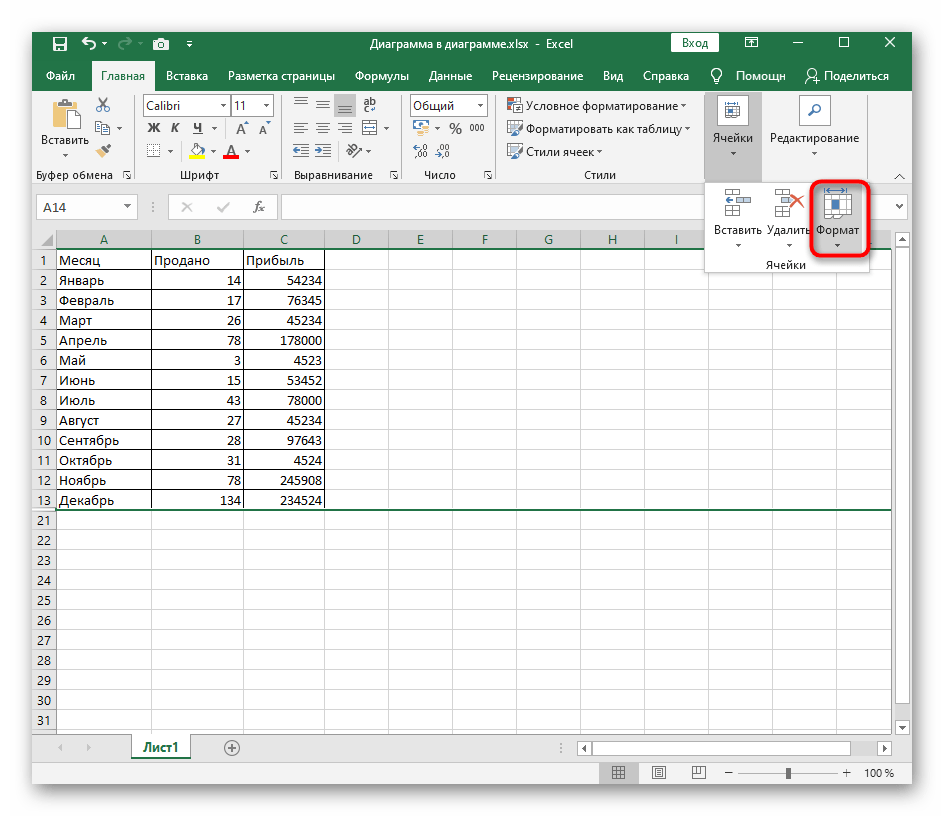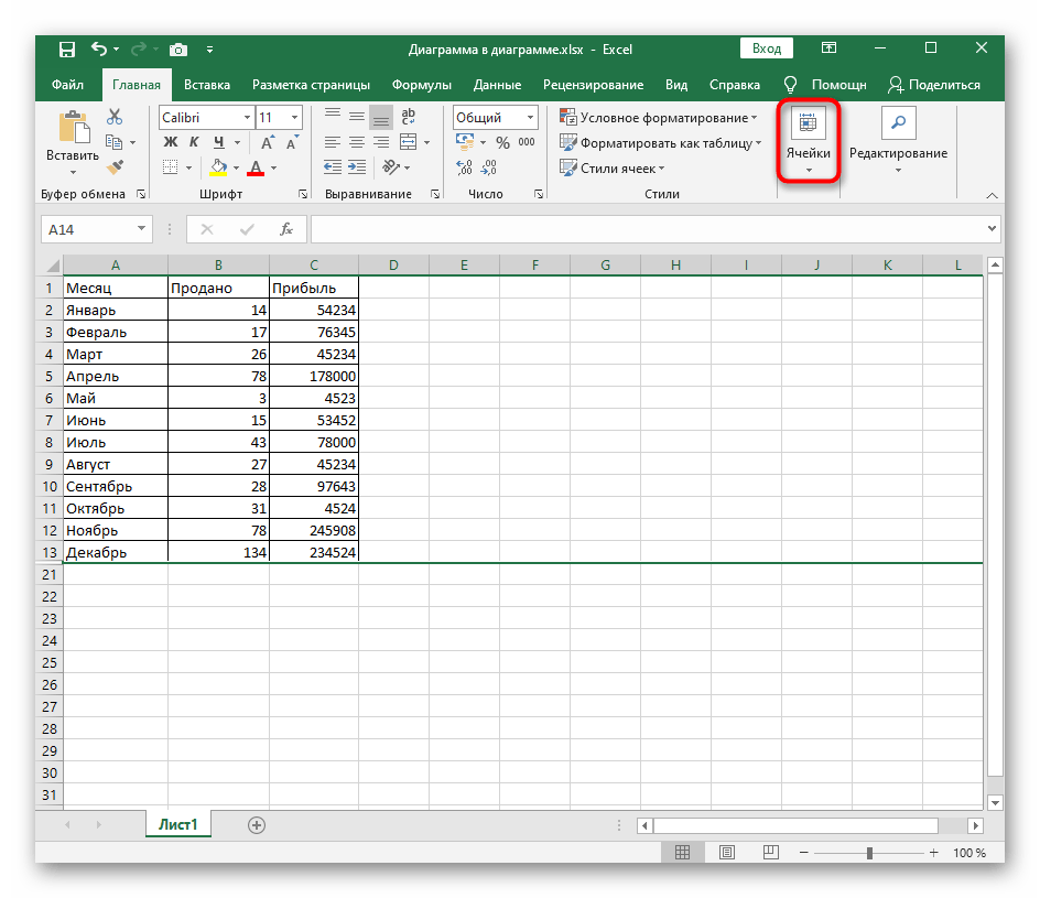- Находясь на вкладке «Основная», откройте блок «Ячейки».