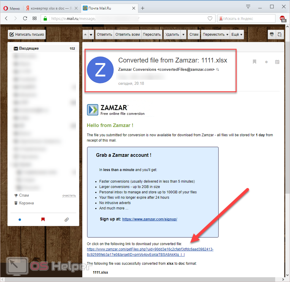 - Заходим в свою почту и открываем нужное письмо. Внизу вы увидите ссылку на файл с результатом. Необходимо кликнуть на неё.