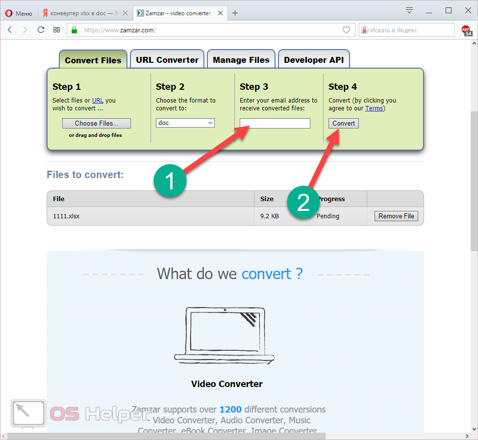 - Дальше необходимо указать адрес электронной почты, на которую будет отправлено письмо со ссылкой на результат. Для запуска конвертации нажмите на кнопку «Convert».