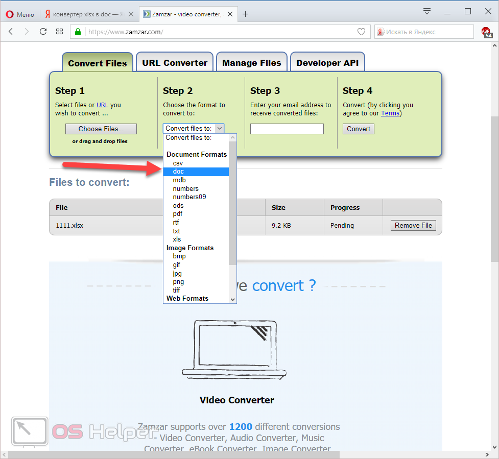 - В пункте «Настройте опции», в настройке «Конвертировать в» выберите формат «Doc».