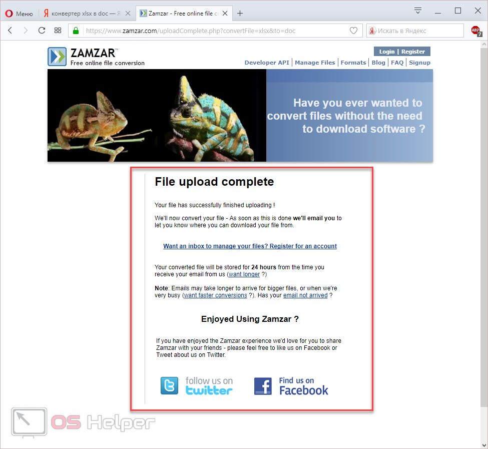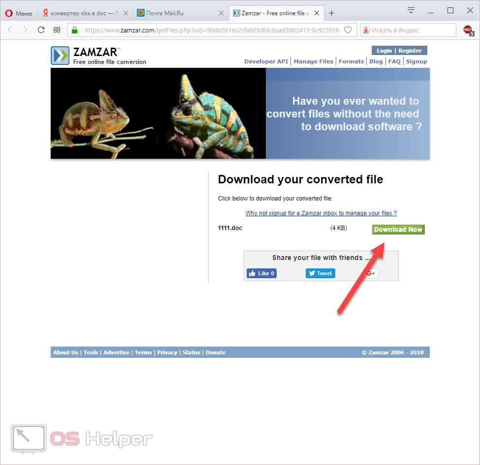 - После этого вы снова окажетесь на сайте «ZamZar». Но на этот раз вы увидите ссылку на скачивание документа. Нажмите на кнопку «Download Now».