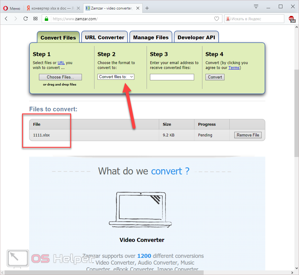 - В результате этого вы увидите свой документ в разделе «Files to convert». После этого кликните на выпадающий список во втором шаге (Step 2).
