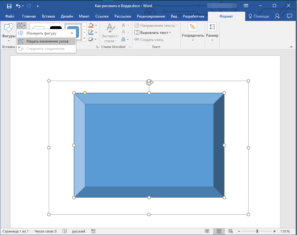 «Изменить фигуру» — выбрав первый пункт в меню этой кнопки, вы можете, в буквальном смысле, изменить фигуру, то есть, вместо одной нарисовать другую. Второй пункт в меню этой кнопки — «Начать изменение узлов». Выбрав его, вы можете изменить узлы, то есть, точки привязки конкретных мест фигуры (в нашем примере это внешние и внутренние углы прямоугольника.
