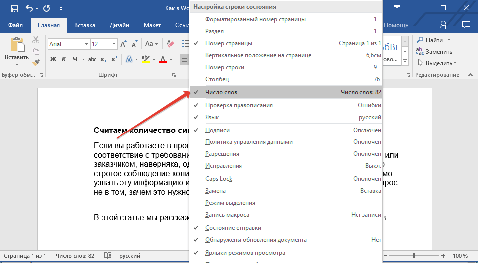 - Совет: Если счетчик страниц/слов не отображается, кликните правой кнопкой мышки на строке состояния и выберите пункт “Число слов” или “Статистика” (в версиях Ворд ранее 2016 года).
