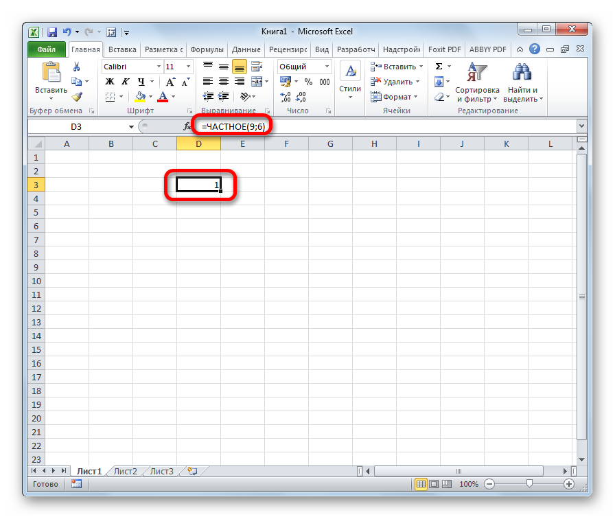 После этих действий функция ЧАСТНОЕ производит обработку данных и выдает ответ в ячейку, которая была указана в первом шаге данного способа деления.