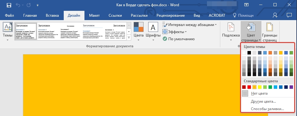 Фон страницы может быть выполнен в любом существующем цвете в палитре Word. Чтобы создать цветной фон для страниц вашего документа, вам необходимо:
