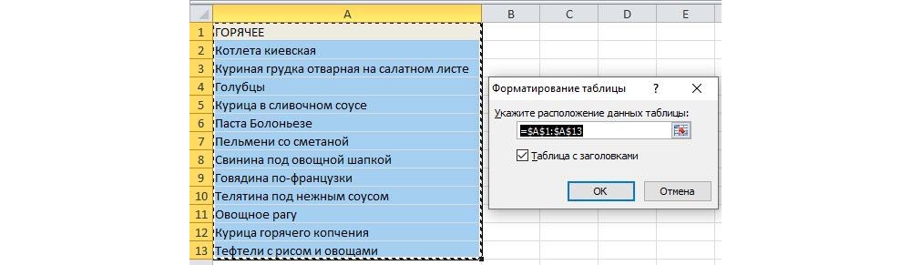 - Выделить содержание, во вкладке «Главная» выбрать «Форматировать как таблицу». В появившемся окне обязательно поставить галочку рядом с пунктом «Таблица с заголовками».