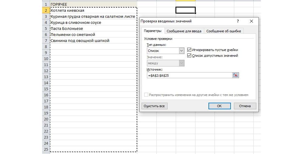 Кликнуть по сторонней ячейке. Перейти во вкладку «Данные» – «Проверка данных». В «Типе данных» выбрать пункт «Список». В поле «Источник» выделить необходимое количество ячеек, но с запасом (можно и весь столбец, формула при этом будет =$A:$A).