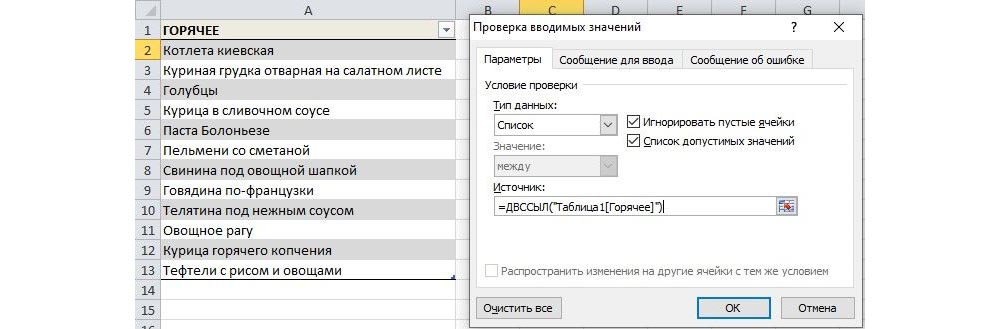- Обозначить готовую таблицу как источник, вписать формулу =ДВССЫЛ(«Таблица1»), где таблица1 – автоматически присвоенное ей имя, – название столбца.