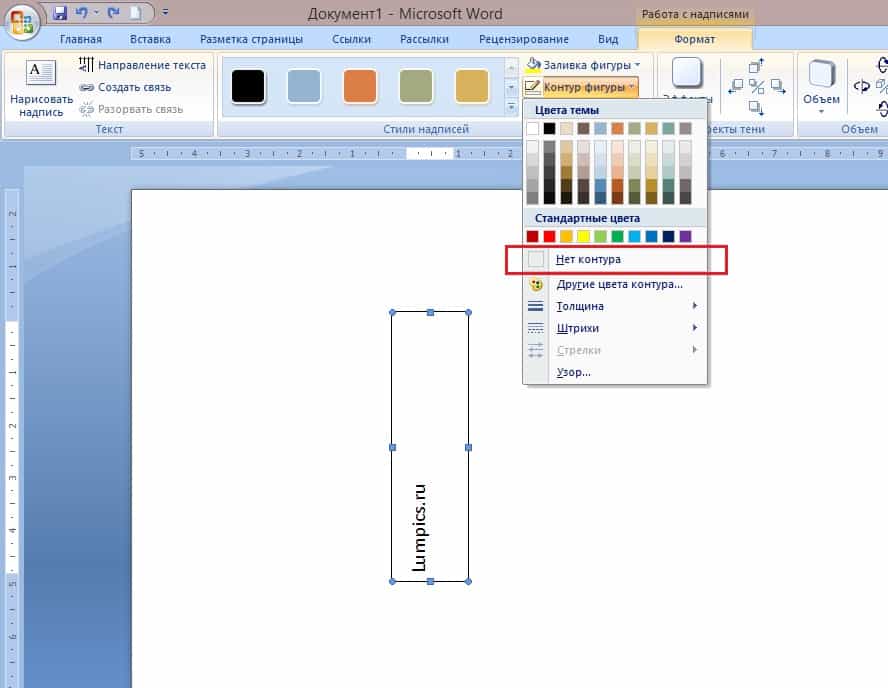 Чтобы из документа убрать рамку, требуется удалить контур фигуры через «Формат» — «Контур фигуры» — «Стили фигур».