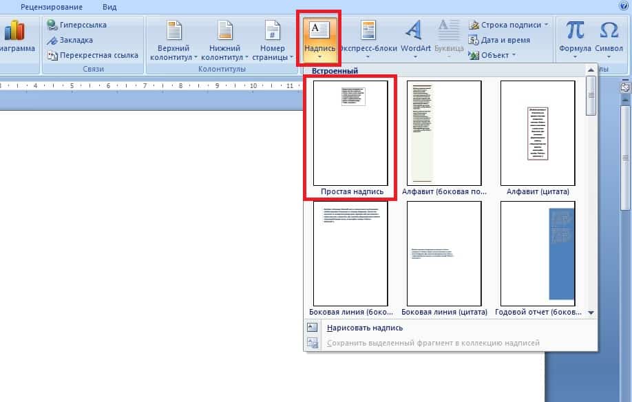 Второй способ даже проще первого. Опять переходим на вкладку «Вставка», далее раздел «Надпись». Во всплывающем меню выбираем вид вставляемой надписи, в нашем случае выбрать самый первый и самый простой вид, не имеющий ненужного нам цветного фона.