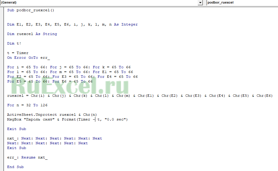 - MsgBox «Пароль снят » & Format(Timer — t, «0.0 sec»)