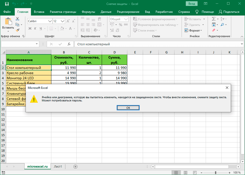 Давайте проверим, срабатывают ли ограничения: попробуйте изменить значение любой ячейки. Уверен, что у Вас это не получится, и увидите следующее уведомление: