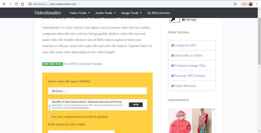 Это еще одна популярная программа для уменьшения размера видеофайлов онлайн. Инструмент поддерживает популярные форматы с максимальным размером файла 500 МБ. Для достижения наилучшего качества файлов существует опция использования низкого уровня сжатия. Вы можете оставить ширину видео одинаковой или масштабировать ее из указанных параметров. Приглушенное видео путем удаления аудио части также может быть создано при необходимости. Для обеспечения безопасности ваших видеофайлов они удаляются автоматически через несколько часов.