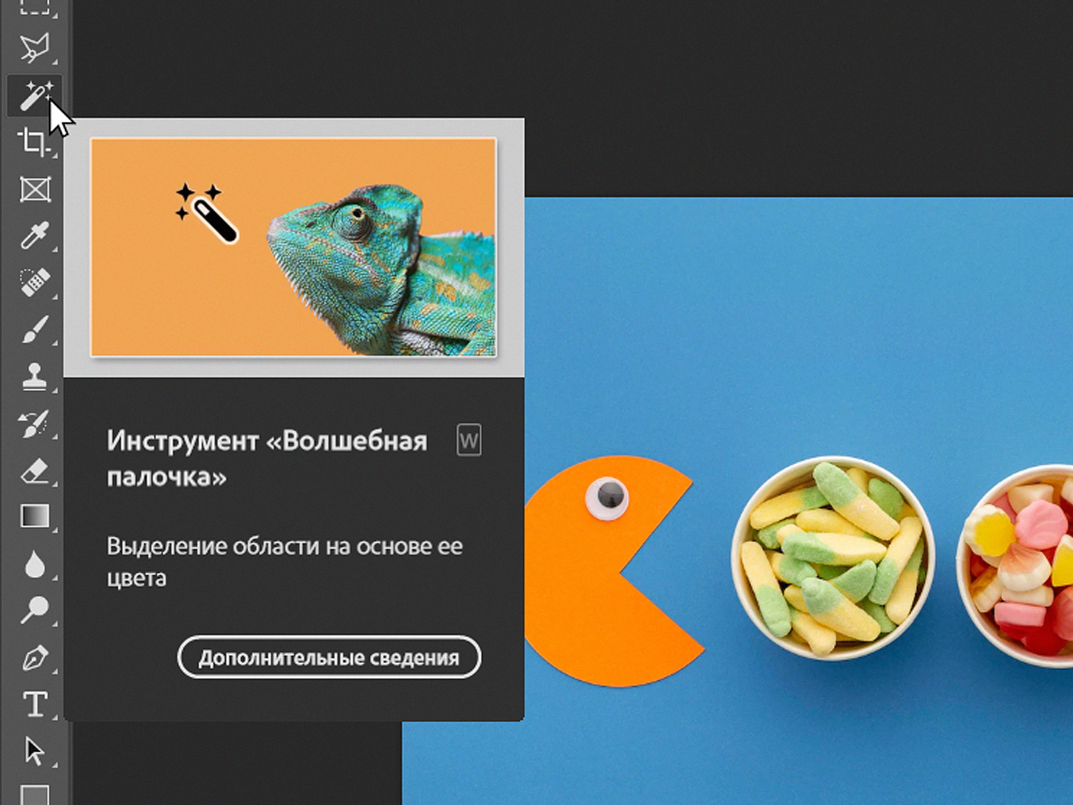 Суть этого инструмента в том, что он выделяет не целое поле сразу, как это делает «Волшебная палочка» или «Цветовой диапазон», а вы задаёте программе размер участка, который хотите обособить.
