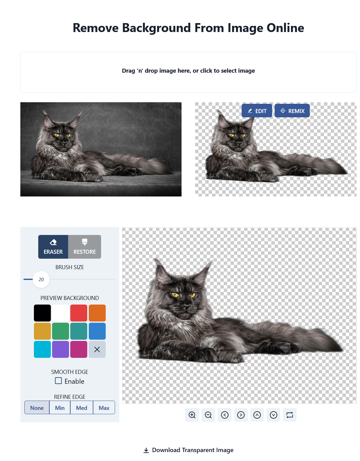 Editphotosforfree – еще один иностранный сервис для вырезания фона с фотографий. Отличается простым интерфейсом. После загрузки обрабатывает фотографию примерно 30 секунд. Это довольно долго по сравнению с такими сервисами как Depositphotos, PhotoScissors Online и remove.bg. При нажатии на кнопку Edit запускается мини-редактор. С его помощью можно восстановить случайно удаленные части объекта и заменить фон.