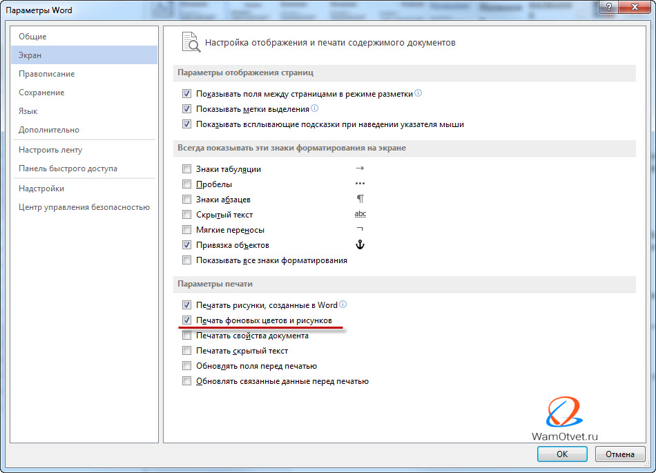 - В разделе «Параметры печати» установить галку «Печать фоновых рисунков и цветов».