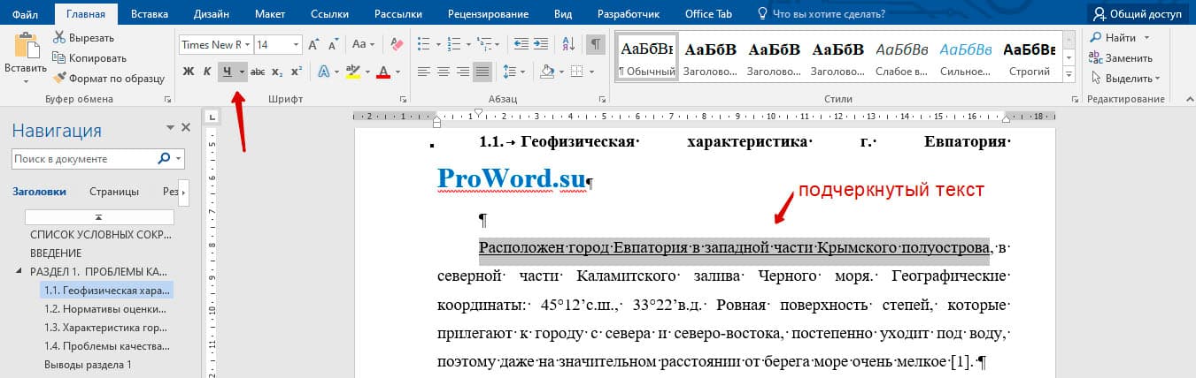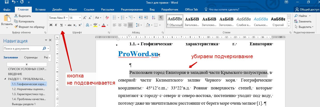 Если текст подчеркнут с использованием стандартной функции подчеркивания Microsoft Word, убрать его можно следующим образом: