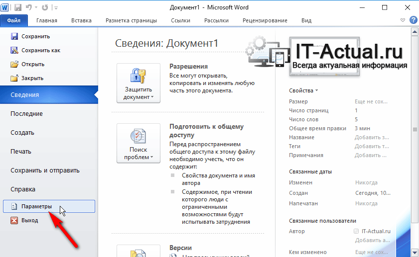 2) В открывшемся меню выберите пункт Параметры (в более ранней версии Word данный параметр именуется Параметры Word).
