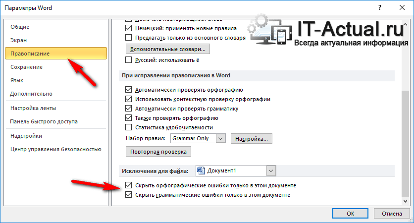 Выберите желаемый вариант, а после установите галочки у находящихся в этом блоке опций, которые отключают проверку орфографических и грамматических ошибок.