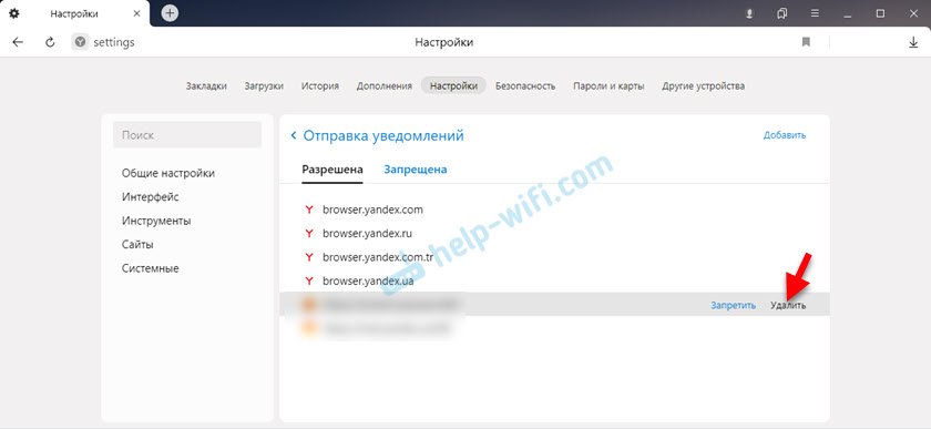 Удаляем сайты, уведомления от которых вы не хотите получать на свой компьютер.