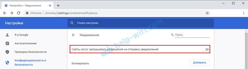 А если вы не хотите, чтобы появлялись эти запросы на показ уведомлений, то можете отключить функцию «Сайты могут запрашивать разрешения на отправку уведомлений».