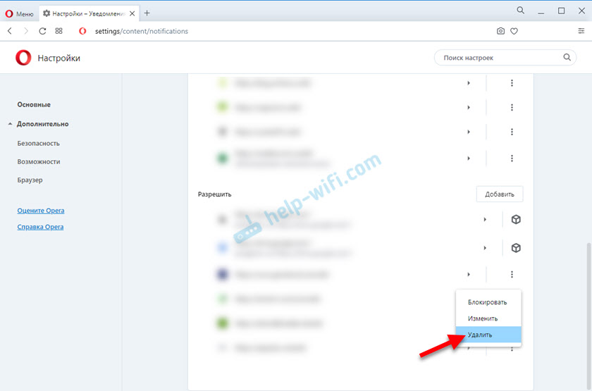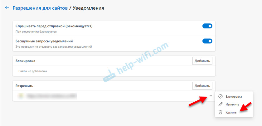 Удалите все сайты в разделе «Разрешить». Или только те сайты, от которых вы хотите отписаться и которые показывают вам рекламу в углу экрана. Просто открываем меню сайта (…) и нажимаем «Удалить».