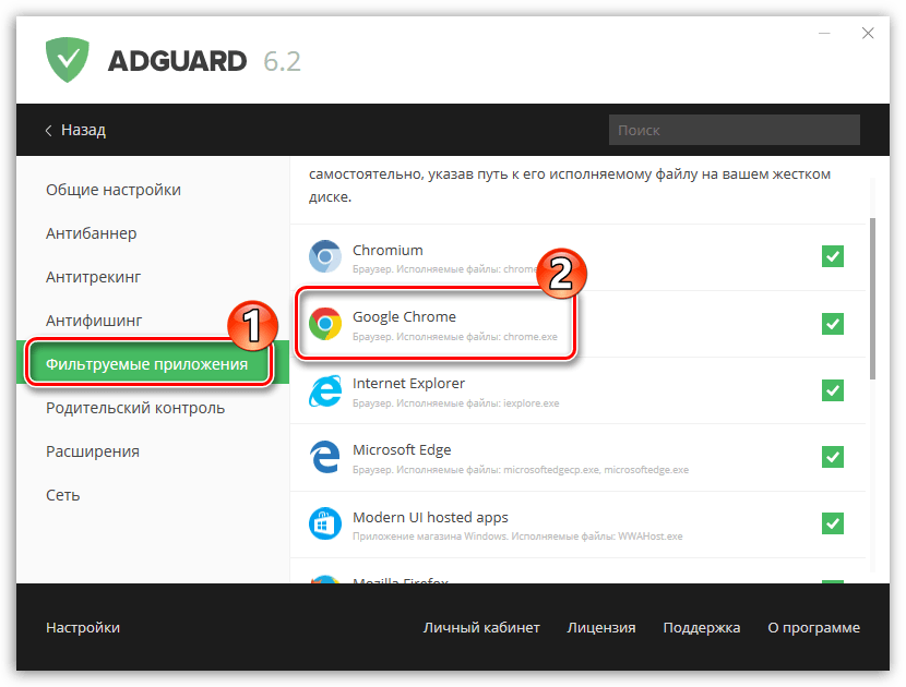 - В левой области открывшегося окна откройте раздел «Фильтруемые приложения». Справа вы увидите список приложений, среди которых вам потребуется найти Google Chrome и убедиться, что около данного браузера тумблер повернут в активное положение.