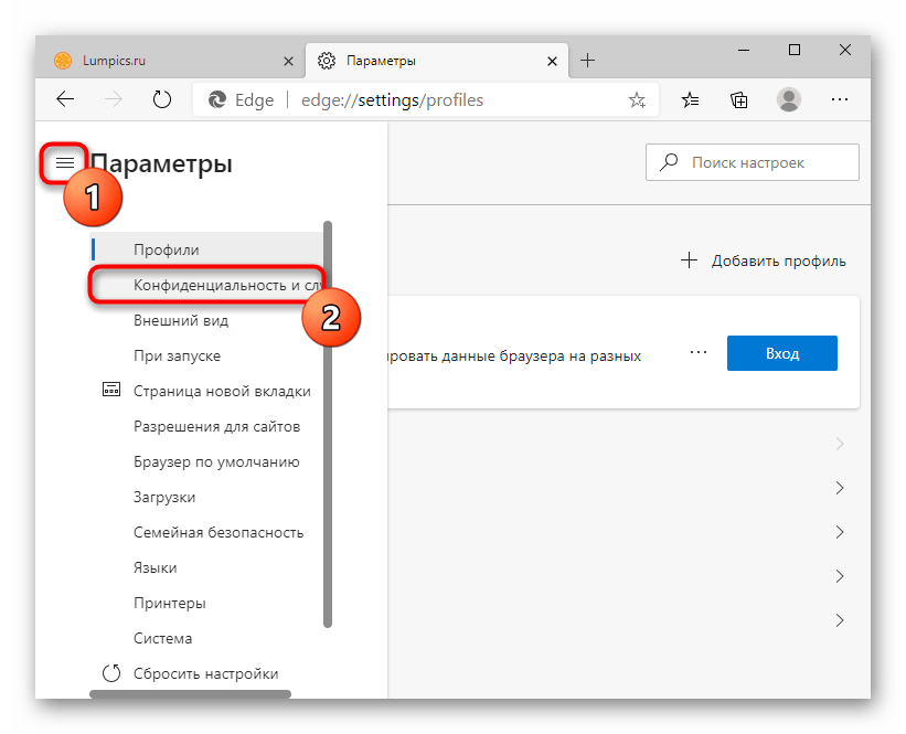 перейти к разделу «Параметры», затем – подраздел «Конфиденциальность и службы» (для переключения достаточно использовать левую клавишу мышки, однократное нажатие);