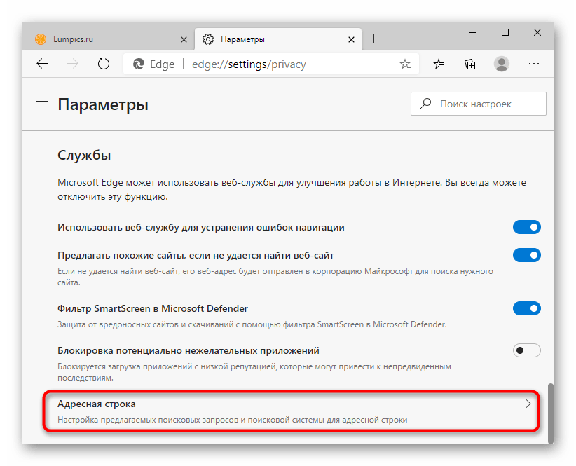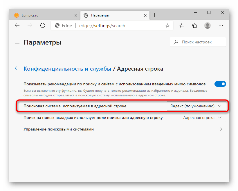 Прокрутите страницу настроек до раздела «Служба поиска». Напротив опции «Поисковая система, используемая в адресной строке» установите желаемую поисковую машину, что будет использоваться в адресной строке.