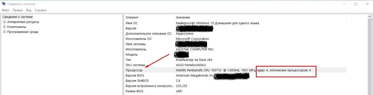 Если отображаемой в свойствах системы информации недостаточно, воспользуйтесь встроенной утилитой «Сведения о системе». Помимо марки и тактовой частоты она позволяет посмотреть, сколько ядер на компьютере Windows 7/10. Запускается утилита командой msinfo32 в окошке «Выполнить». Производитель, марка, частота и количество ядер будут указаны рядом с пунктом «Процессор».
