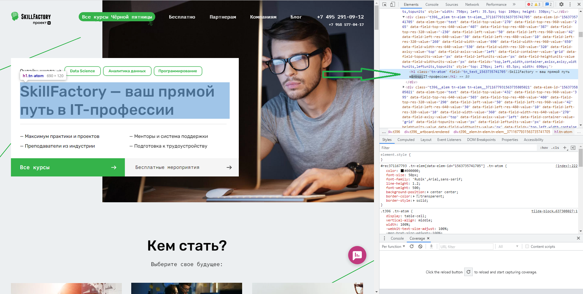 Для этого надо кликнуть по кнопке со стрелкой в левом верхнем углу консоли, а затем — по необходимому элементу на странице.