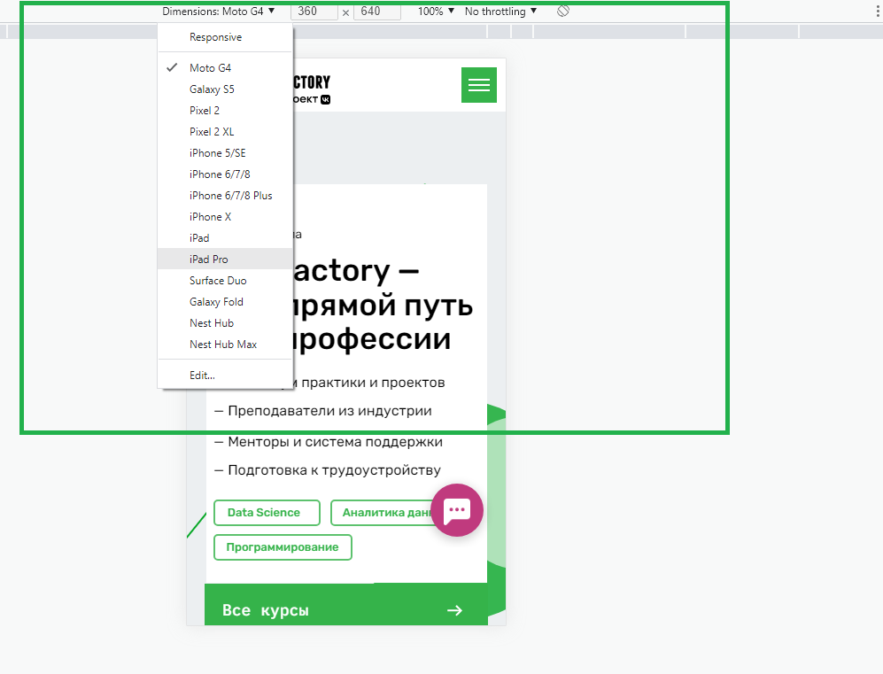 Просмотр внешнего вида сайта на разных устройствах. В режиме разработчика Google Chrome можно посмотреть, как выглядит текущая страница практически на любом устройстве. Сделать это можно комбинацией клавиш Ctrl + Shift + M для Windows и Linux и cmd + Shift + M для macOS. Также можно кликнуть на значок телефона в левом верхнем углу консоли. Теперь можно выбрать абсолютно любое разрешение или конкретное устройство из списка Dimensions. Также инструмент позволяет посмотреть, как будет отображаться страница при разной скорости интернета.