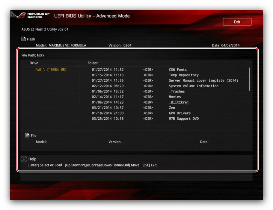 Утилита ASUS CrashFree BIOS 3 запускается автоматически, если наблюдаются проблемы с загрузкой БИОСа. Её интерфейс подобен инструменту прошивки EZ Flash: при подключённом накопителе отображается панель файлового менеджера с возможностью выбрать прошивку. Выберите помещённый ранее файл, используя подсказки на экране, и начните процедуру обновления микропрограммы.