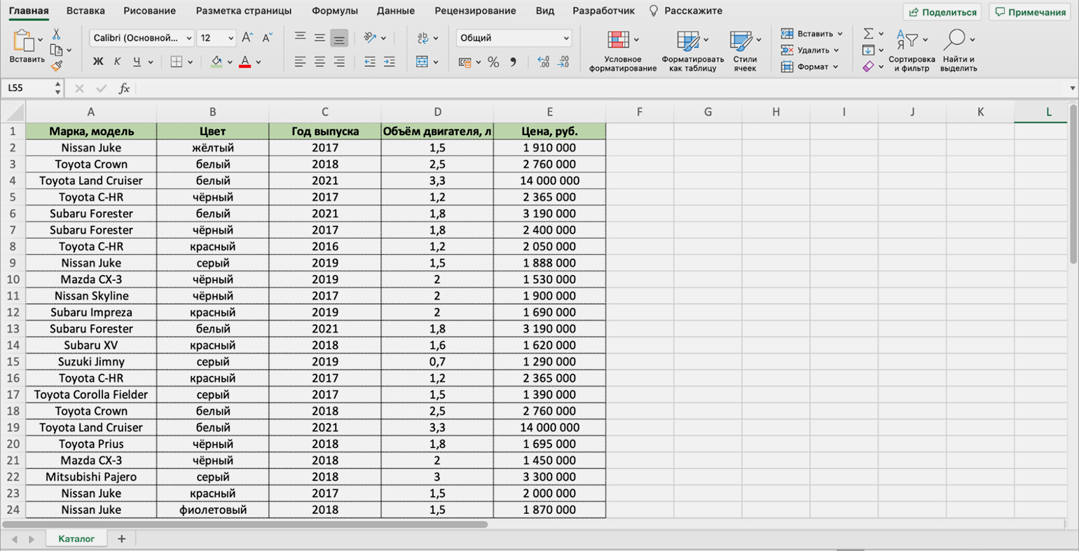 Так выглядит каталог автомобилейСкриншот: Excel / Skillbox Media