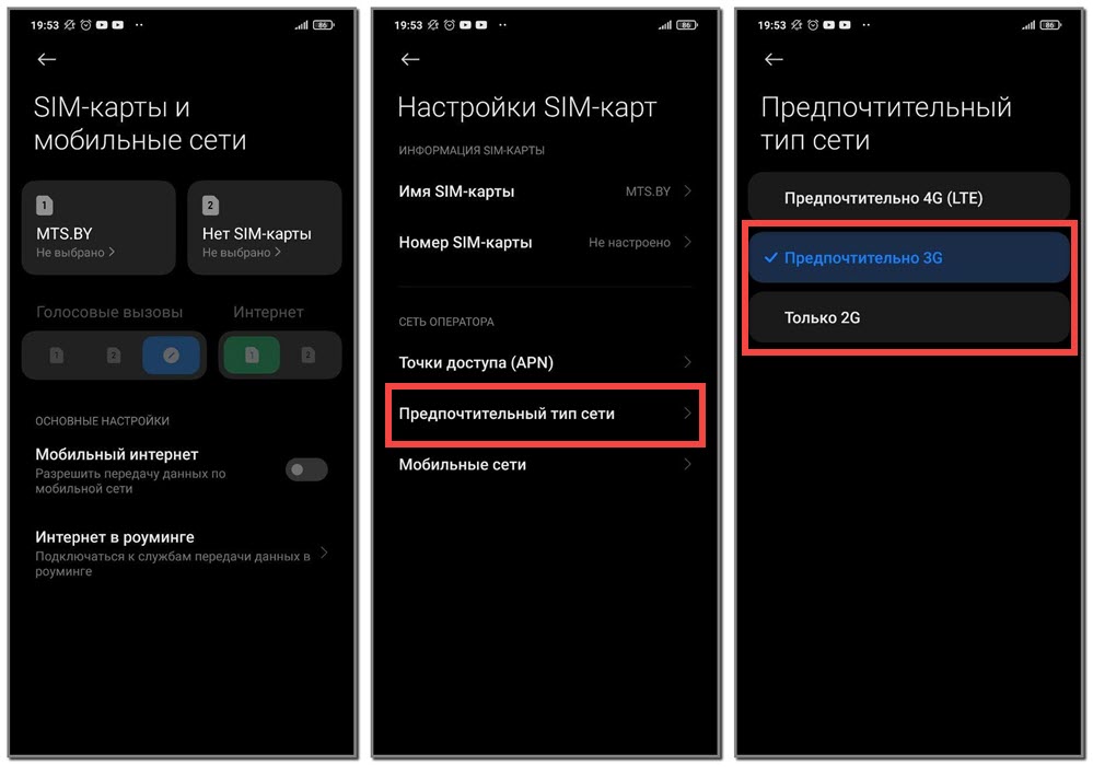 Порой неполадку вызывает плохое покрытие сетей 3G/4G – рядом с индикатором уровня сигнала будут постоянно сменяться значки. Решением станет переключение на пониженный стандарт. Делается это следующим образом (на примере Xiaomi):