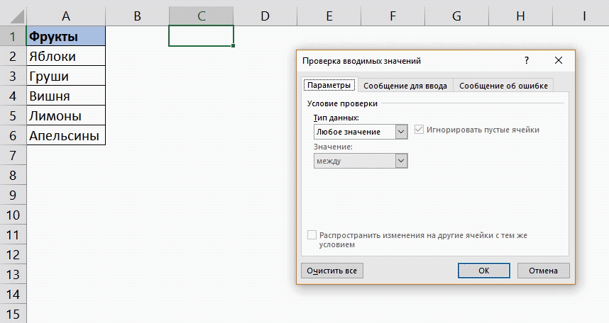 Во всплывающем окне “ Проверка вводимых значений ” на вкладке “ Параметры ” в типе данных выбрать “ Список “: