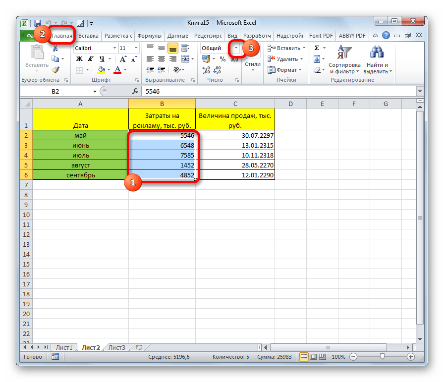 - Переходим во вкладку «Главная». При этом, нужно выделить соответствующие ячейки на листе, а в блоке настроек «Число» на ленте открыть поле выбора.